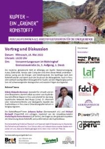 Veranstalter:innen: Lateinamerika-Forum Berlin e.V. (LAF), Forschungs- und Dokumentationszentrums Chile-Lateinamerika e.V. (FDCL), Germanwatch e.V., Informationsstelle Peru e.V., Kampagne „Bergbau Peru – Reichtum geht Armut bleibt“, PowerShift e.V.
